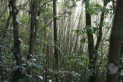 這次我們將車停在玉皇宮附近的停車場,開始步行登山,這裡沿途都有樹遮蔭,本想寫這裡也很適合避暑,但上上下下得行進姆指、食指、中指峰後,明明是太陽公公躲在雲後面的天氣,在中指峰看到隊友及問路的朋友,頭髮像是淋浴過般,男生的短髮濕透外還附著水珠,訝異得多看幾眼,記得這附近都沒有泉水可洗,山林間自然的烤箱,毒素應該排掉不少了。| 五指山上的竹林,休息一下聽聽有蟬鳴鳥叫。 |
