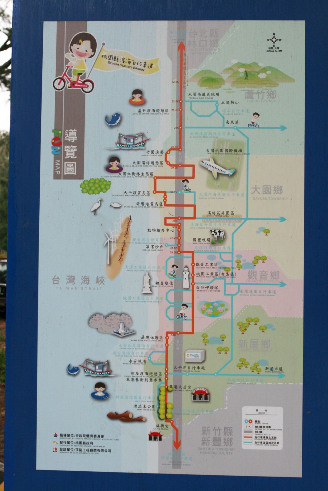 我們來到新屋綠色走廊時,天氣看起來就像快要下雨了, 所以只預定停留半小時,結果由入口一小段到海邊時與就愈飄愈大,還好我有帶傘(登山時帶輕便小雨衣、逛街時帶傘最方便了),所以還可以從容優雅的走回遊覽車上。所以對新屋綠色走廊的印象就只有自行車步道規畫得很不錯,還把路線圖照回來,下次找機會來趟自行車之旅。(由綠色走廊的桃園縣濱海自行車道不僅可以騎到永安漁港,還可以騎到淡水八里。)